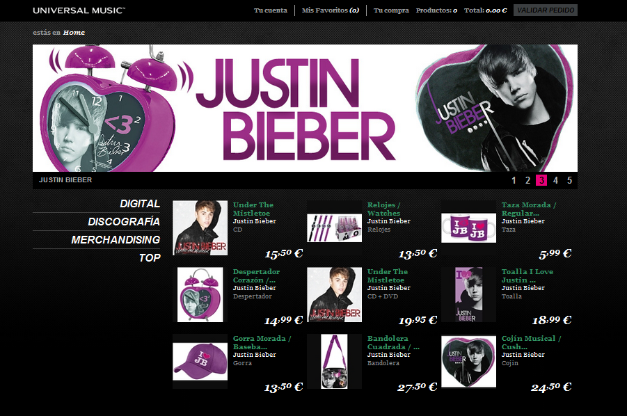 Justin Bieber ya cuenta con tienda oficial de merchandising en España, llevada por Universal Music. En la tienda podrás comprar todo el merchandising, CDs, camisetas, etc... desde relojes a cojines, pasando por gorras!